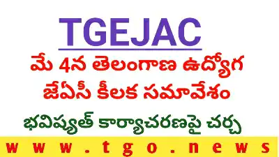 TGO NEWS (APR. 29) : TGEJAC meeting on 4th may for future action plan. తెలంగాణ ఉద్యోగుల జేఏసీ మే 4వ తేదీ మధ్యాహ్నం 2.00 గంటలకు హైదరాబాద్ లో రాష్ట్రస్థాయి కీలక సమావేశాన్ని ఏర్పాటు చేసుకుంది.