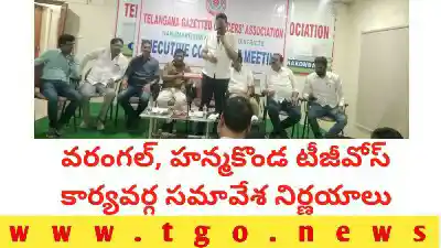 TGO NEWS (MAR ) : WARANGAL and HANUMAKONDA TGOS MEETING. హనుమకొండ టీజీఓ భవన్ లో జరిగిన హనుమకొండ మరియు వరంగల్ జిల్లాల కార్యవర్గ సమావేశంలో హనుమకొండ అధ్యక్షులు మురళీధర్ రెడ్డి గారు, కార్యదర్శి డాక్టర్ ప్రవీణ్ కుమార్ గారు, వరంగల్ జిల్లా అధ్యక్షులు రాంరెడ్డి గారు, కార్యదర్శి ఫణి కుమార్ గారు, హనుమకొండ కోశాధికారి రాజేష్ కుమార్ గారు, వరంగల్ జిల్లా కోశాధికారి ఈగ వెంకన్న గారు రెండు జిల్లాల కార్యవర్గ సభ్యులతో పాటు మహిళా గెజిటెడ్ అధికారులు పాల్గొన్నారు.