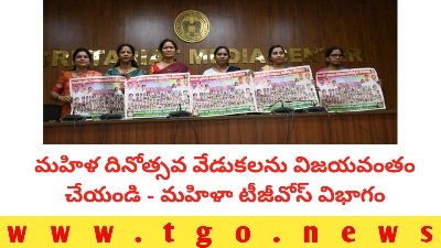 ఉద్యమ స్ఫూర్తితో టీ జి ఓ మహిళా విభాగం నేతృత్వంలో జరిగే మహిళా దినోత్సవ ఉత్సవాలను విజయవంతం చేయాలని విజ్ఞప్తి చేస్తున్నట్లు ఈ సందర్భంగా టీజీవోస్ మహిళా విభాగం అధ్యక్షురాలు దీపారెడ్డి, కార్యదర్శి సుజాత తెలిపారు.